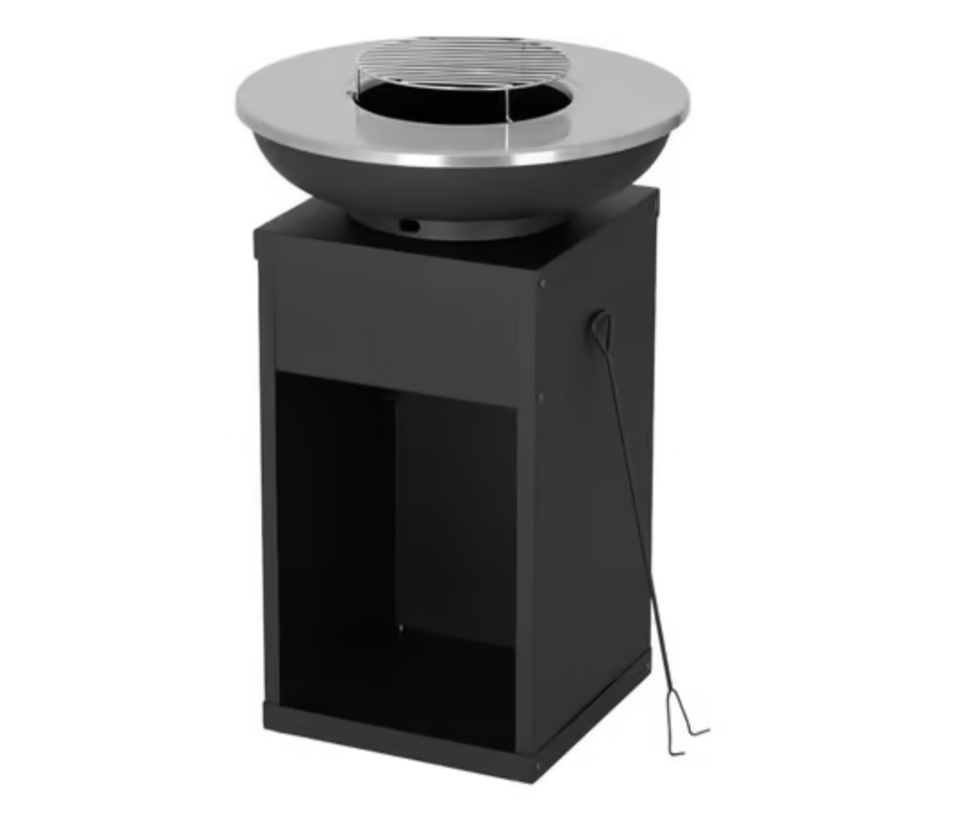 La plaque de cuisson et la grille vous offrent un large espace pour vos viandes et légumes. Le rangement pour bois intégré et le tisonnier avec manche long ajoutent praticité et sécurité. Un brasero robuste en acier peint noir, idéal pour les repas d’extérieur toute l’année.