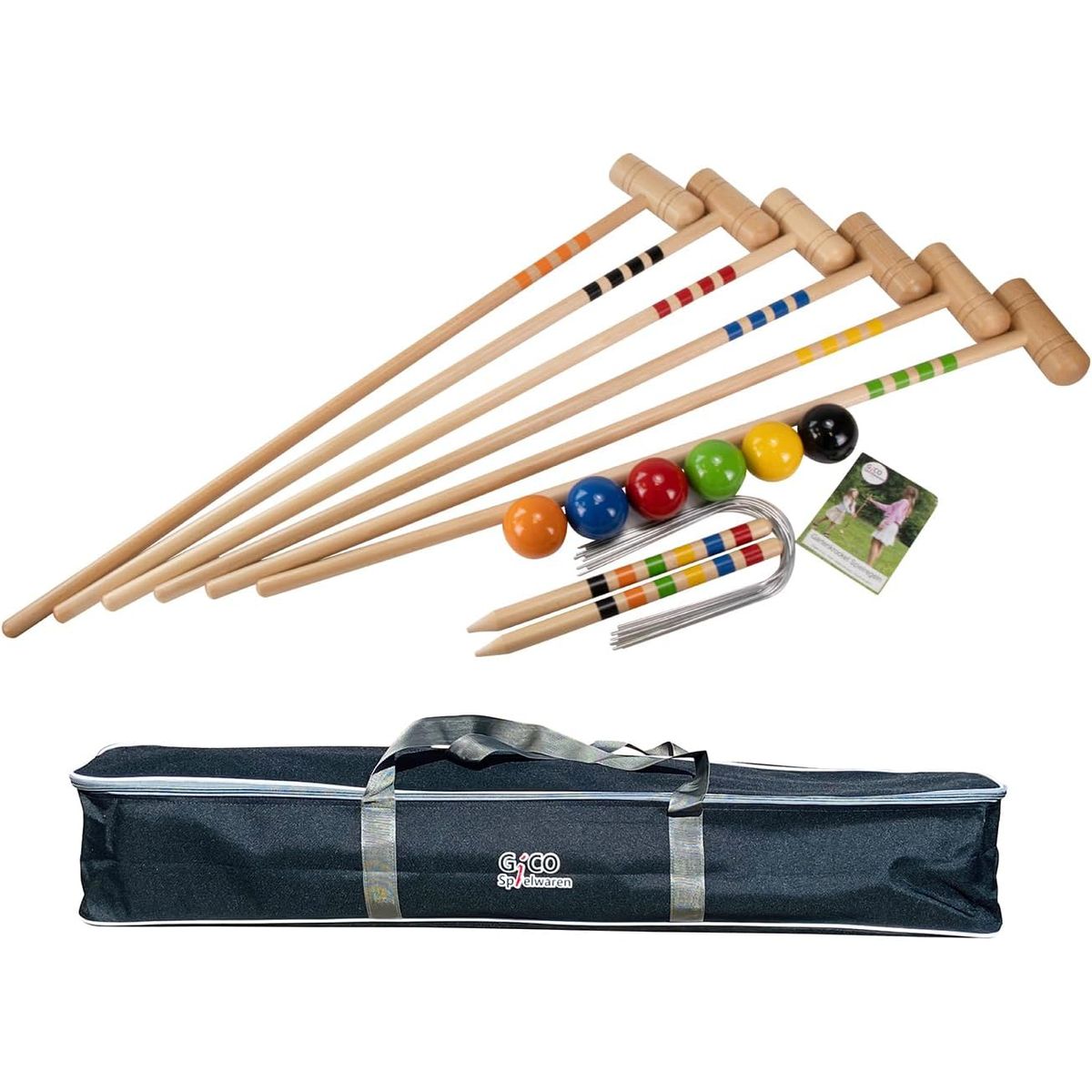 Set complet pour 6 joueurs avec maillets 100 cm, idéal pour adultes. Livré avec sac de transport. Parfait pour des parties conviviales en extérieur !