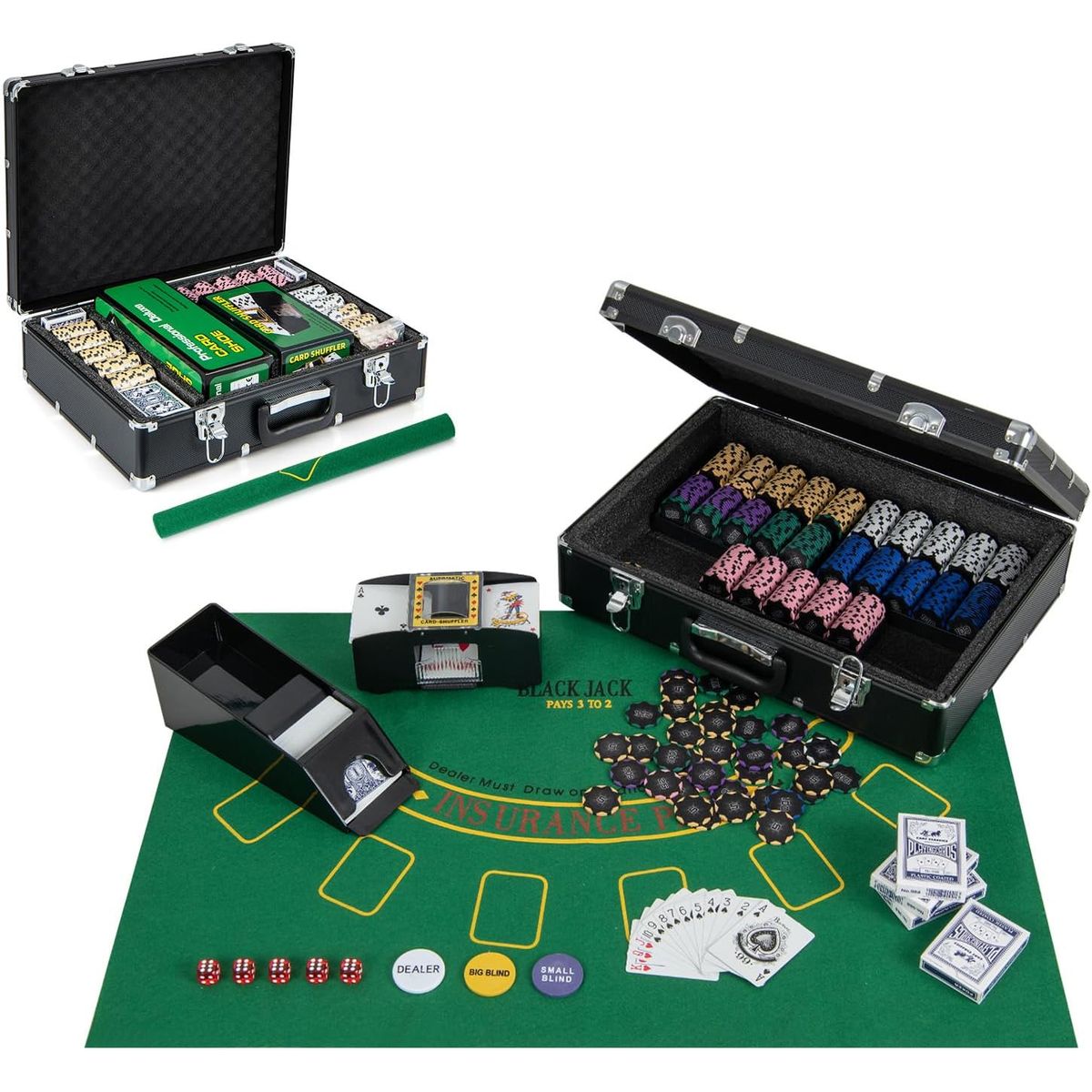 Mallette complète avec 600 jetons, mélangeur, distributeur, 6 jeux de cartes, 5 dés et 3 jetons « Dealer ». L’indispensable pour vos soirées poker et ambiances casino !
